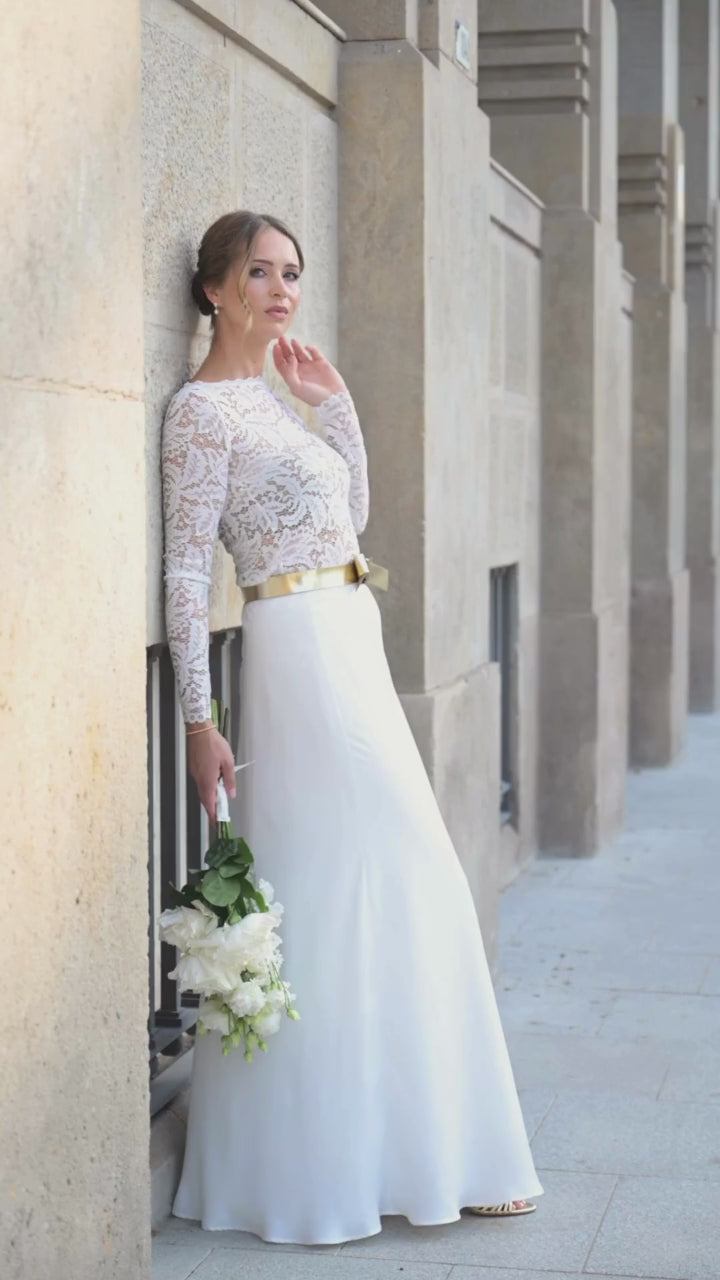 Entdecke das zauberhafte Spitzenoberteil mit Langarm und elegantem U-Boot Ausschnitt, das sich perfekt für Deinen modernen Brautlook eignet. Dieses elegante Oberteil ist Teil unserer exklusiven Mix & Match Kollektion und bietet Dir die Möglichkeit, Deinen individuellen Hochzeitsstil zu kreieren.